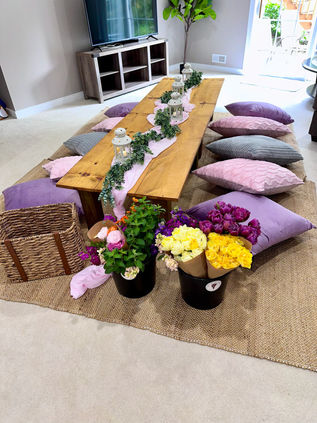 Our low-profile picnic table is perfect for eating, playing games, or conversation with some drinks. We can make accommodations for up to 10 people. It includes rugs, pillow seating, greenery, battery operated lanterns, & a basket for shoes. You can rent this as a stand-alone item or as an add-on.